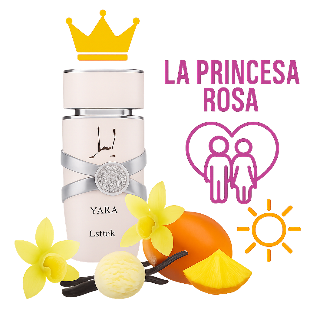 Lattafa Yara, “La Princesa Rosa”, es una fragancia femenina encantadora, dulce y tropical, ideal para el día. Su perfil atalcado y gourmand combina frutas exóticas, vainilla cremosa, almizcle suave y orquídea floral, creando una estela delicada y envolvente. Perfecta para primavera y verano, brilla en citas románticas, entornos laborales y momentos diurnos donde se busca elegancia con dulzura.